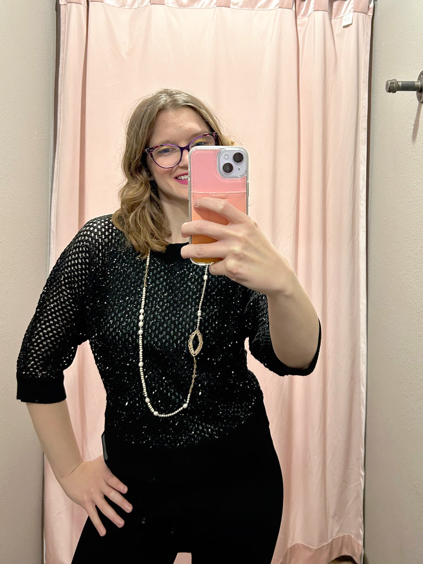 Knitted, 3/4 Sleeve, Crew Neck Sweater w/ Sequence Detail