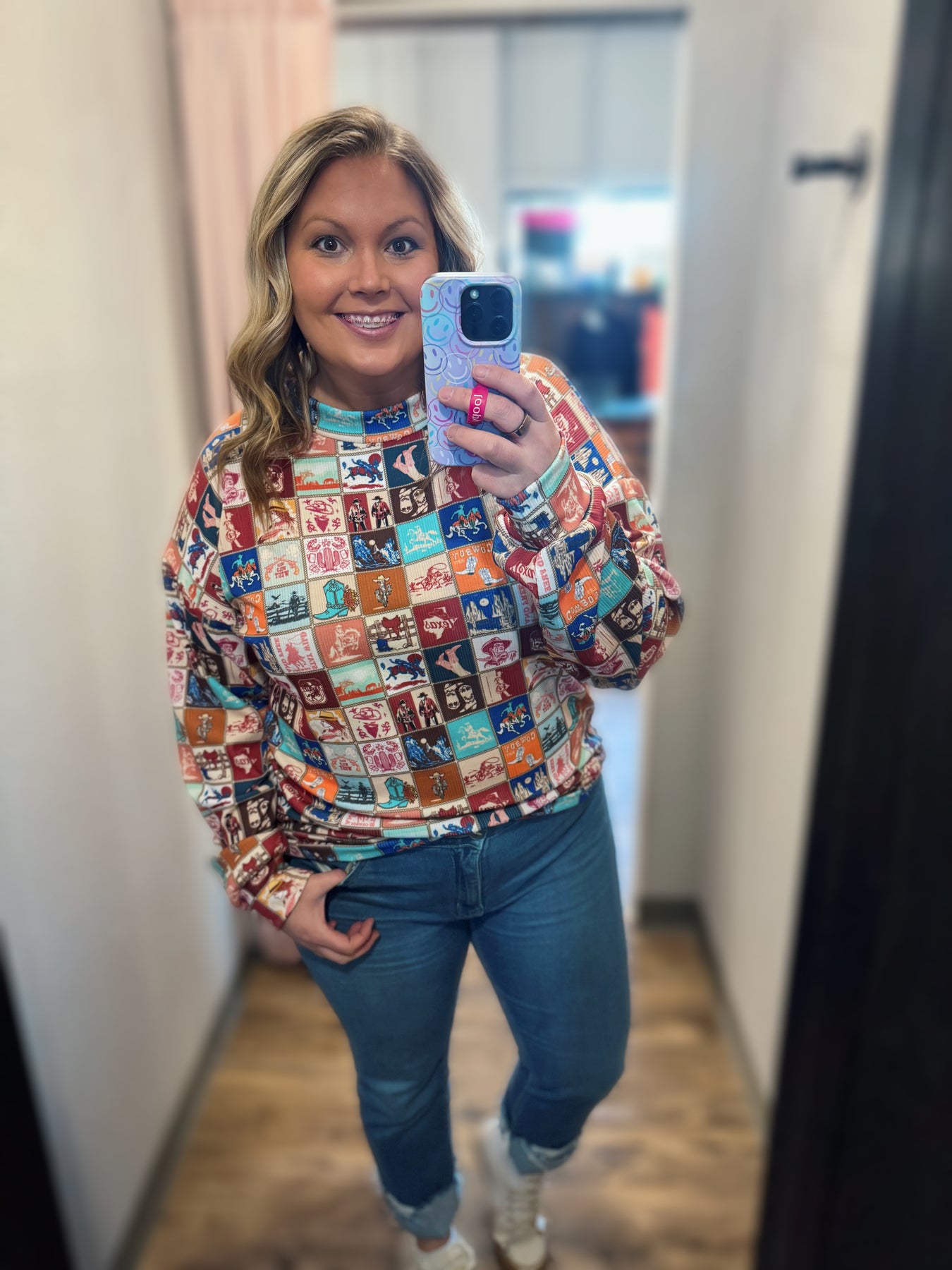 Multi Colored Checkered Top w/ Western Print Design