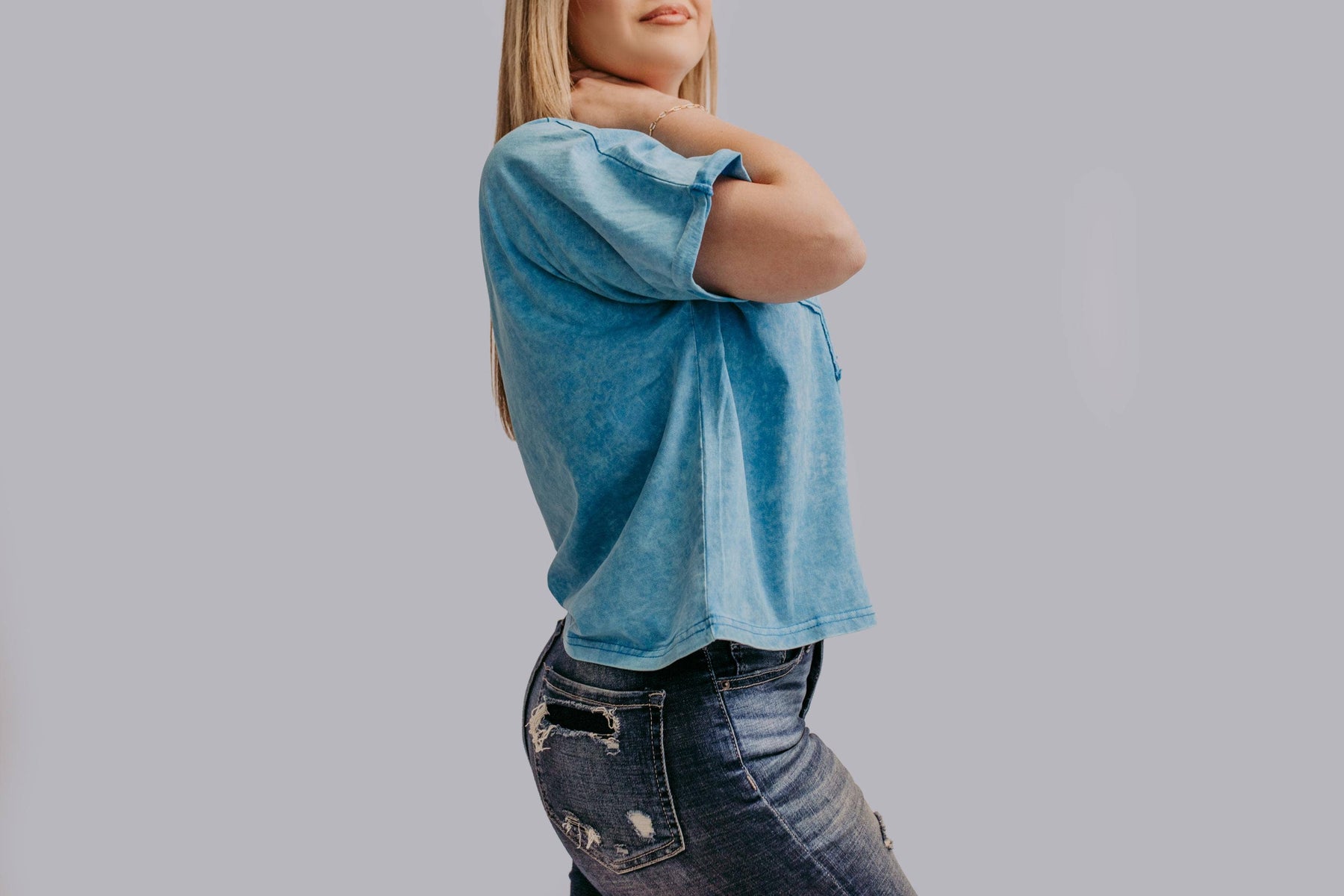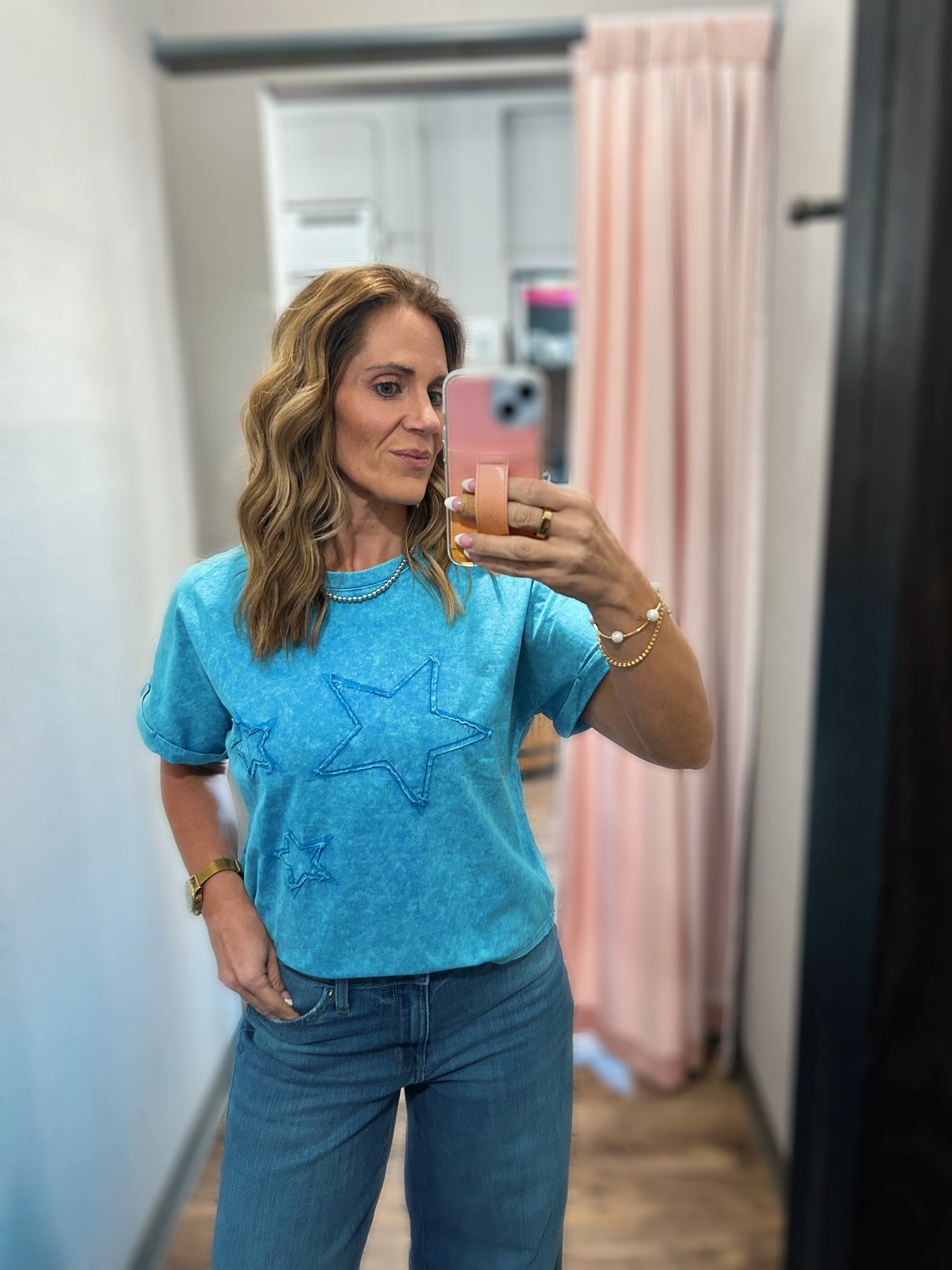 Bright, bold, and ready for anything—this cropped tee is all about standout style. Made in a washed turquoise blue with playful star patches across the front, it’s an easy throw-on piece that still feels special. Pair it with cutoffs for a laid-back summer vibe or layer it under a jacket for a pop of color year-round.