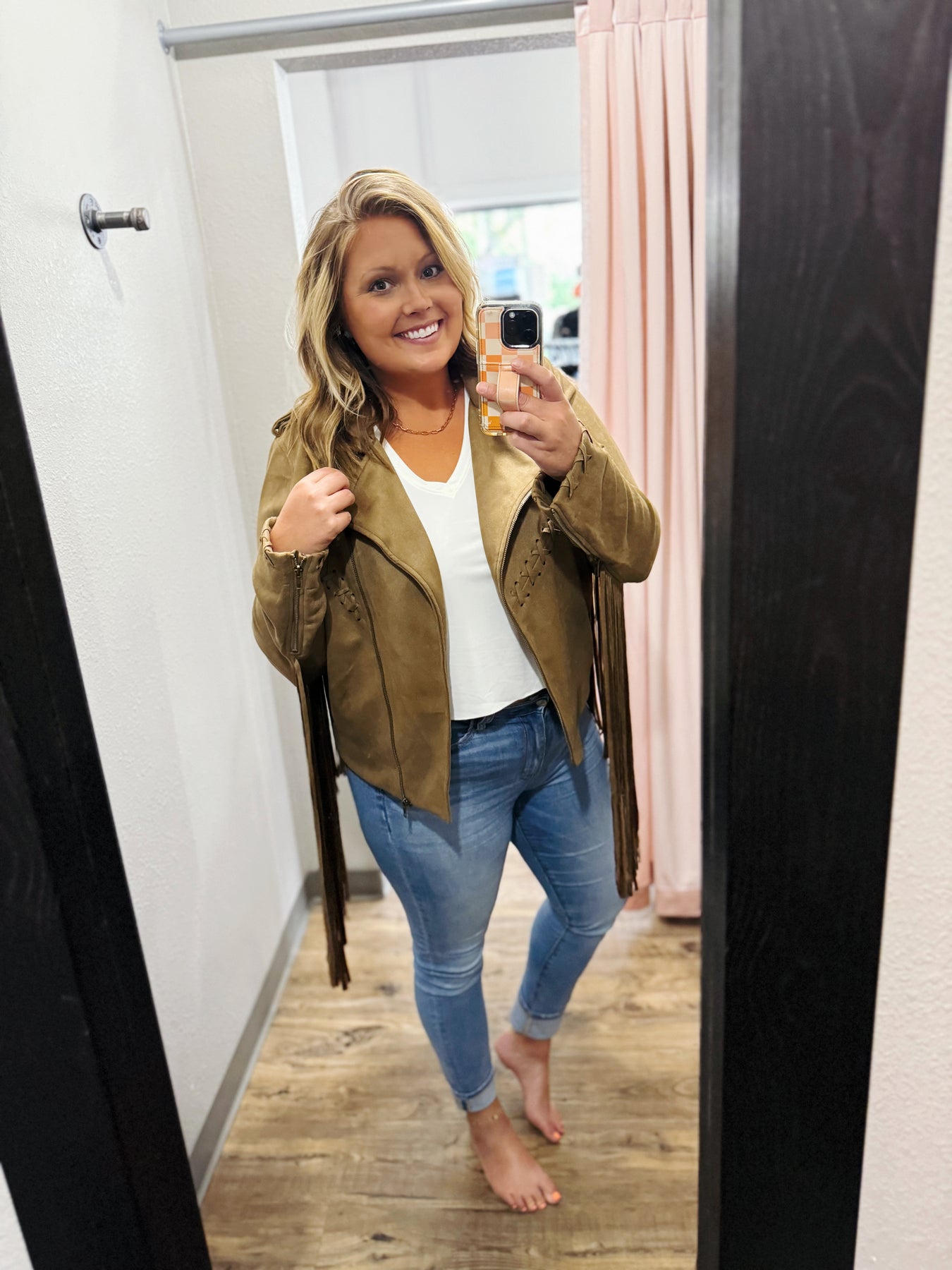 Sude Like Moto Jacket w/ X Stitch Detail, Side Zipper and Fringe on Back and Sleeves