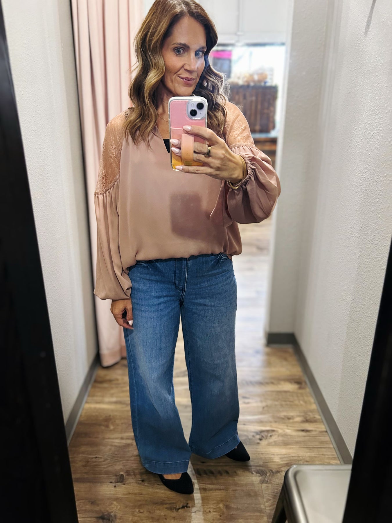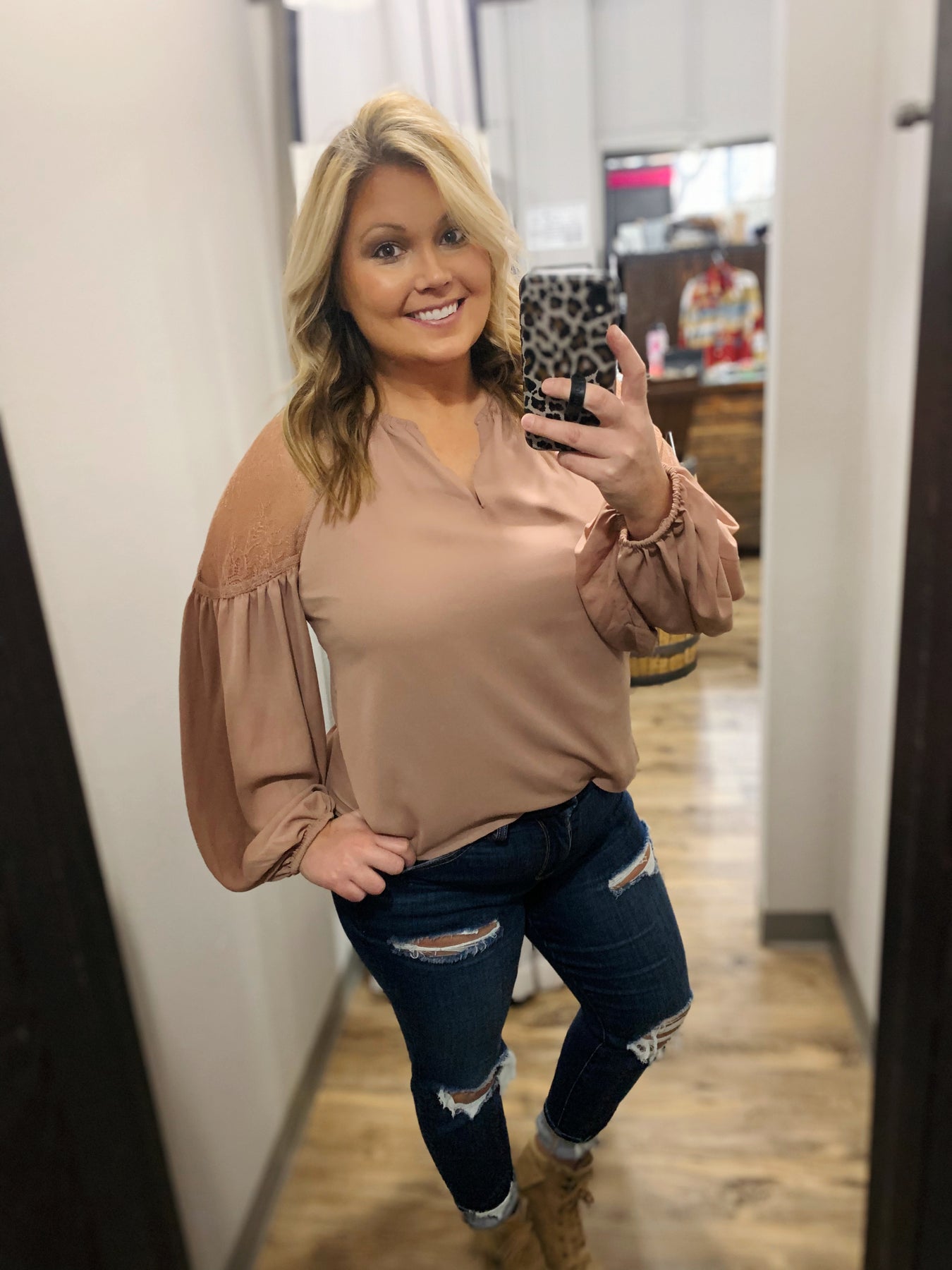 Slit VNeck Blouse w/ Oversized Balloon Sleeves with Lace Detail on Shoulder